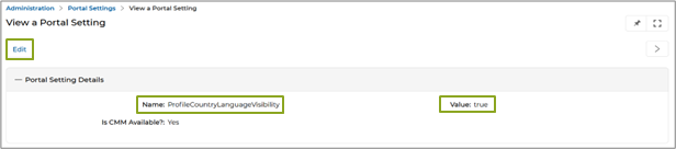 - Once on the View a Portal Setting page, click the Edit button. To enable the Portal Setting, provide value in the value field.