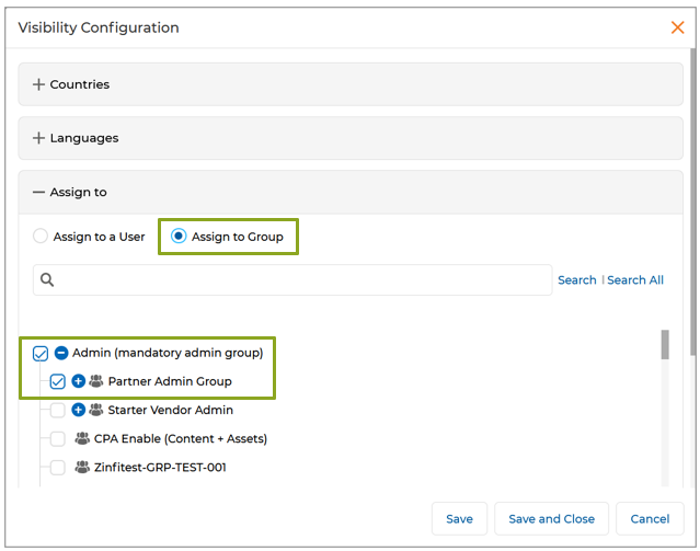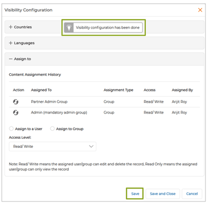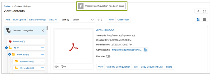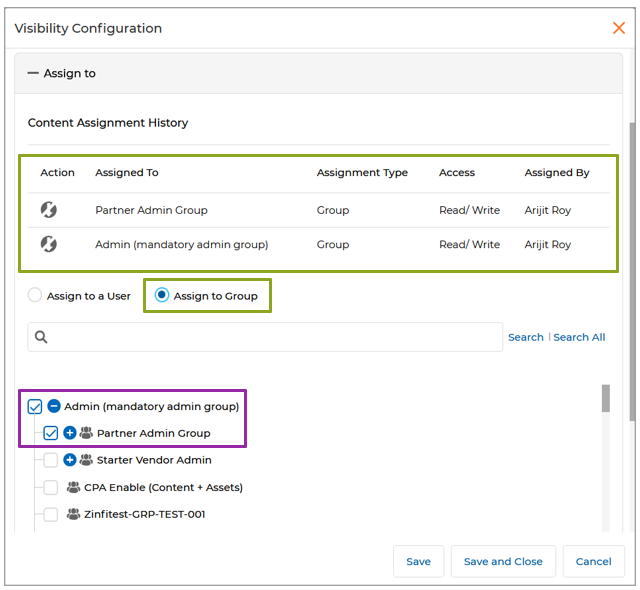 - Display Saved Groups and Users as Selected in the Visibility Configuration Window : The Visibility Configuration feature now automatically displays saved groups and users pre-selected in the User and Group tree. This improvement enhances the admin experience by providing a clear view of existing visibility settings. The intuitive interface ensures admins can effortlessly verify and update configurations, streamlining the content management process. This fix is applied across all applications where the Visibility Configuration feature is integrated.