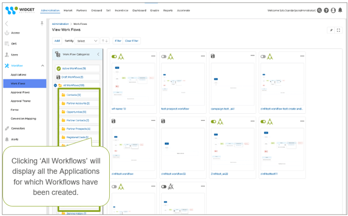 - Workflows Gallery: The Workflows Gallery offers an improved interface with enhanced workflow management functionality. A thumbnail snapshot visually represents each workflow, displaying key details such as its name, status indicators, and action buttons. Administrators can easily manage workflows using quick-access buttons for viewing, editing, cloning, and deleting. The gallery also includes filtering and sorting options, allowing workflows to be refined by creation date, modification date, or name across categories or specific applications. Workflows are organized into application-specific categories within a collapsible tree structure, ensuring seamless navigation and organization.