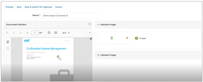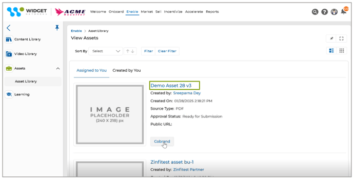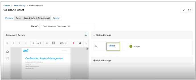 - Auto Cobranding of Assets (Images) - as preset in Categories: For partners, this enhancement simplifies the asset customization process within the Asset Library. Partners can choose images from designated Content Library categories when selecting an asset for co-branding. A real-time preview feature enables them to adjust alignment and sizing before finalizing changes, ensuring precise customization. Additionally, a side panel allows for easy content search, enhancing efficiency. The visibility logic for accessing the Content Library in the Asset Co-Brand section remains consistent with the stand-alone Content Library, ensuring seamless and intuitive user experience.