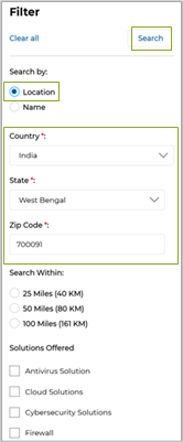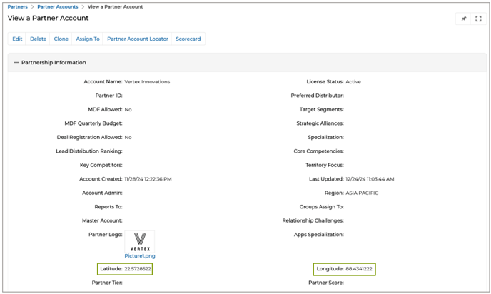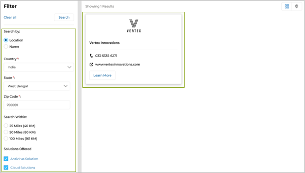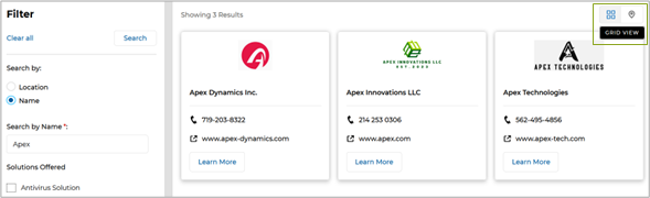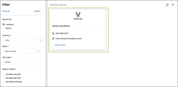 - Partner Locator Enhancements: The enhanced Partner Locator equips administrators with powerful tools for precise partner discovery by buyers and end-prospects, featuring Google Maps-integrated search parameters such as location-based filters (country, state, zip code, and radius) while also allowing for accurate location data input through latitude and longitude details in the Partner Account settings to enable seamless integration with Google Maps for Location View functionality. The integrated Google Maps feature helps by providing a visual map interface, allowing users to easily locate partners based on geographic proximity and quickly assess their locations. The Locator also features a revamped look and feel, featuring a Grid View of partner listings.