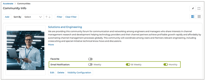 - Mark Communities as Favorites and Configure Community Email Notifications: This feature enhances community management by allowing users to personalize their experience with favorite communities and tailored email notifications. By marking communities as favorites, users can quickly access relevant discussions from their dashboard, improving engagement and navigation. Customizable email notifications—set to Weekly, Bi-Weekly, or Monthly—keep users informed about important updates, fostering continuous participation and ensuring they never miss key discussions or announcements.