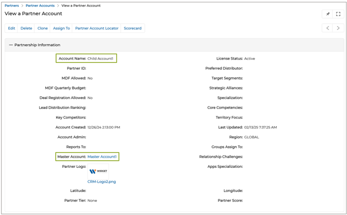 - Master/Parent-Child Partner Accounts and Record Visibility: The Master/Parent-Child Partner Accounts feature enables partner organizations to establish hierarchical relationships between partner accounts, allowing a parent-partner account to access and manage records from its associated child accounts. This ensures seamless data flow, centralized visibility, and efficient collaboration across different regional or business entities. By configuring these relationships through intuitive administrative settings, organizations can streamline operations and maintain a unified view of partner activities.