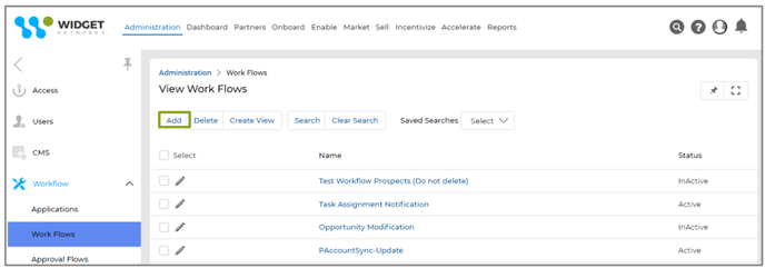 - To Create a new Workflow for an application that will be triggered when a record is deleted, navigate to Administration > Workflow > Work Flows. A new Work Flow can be created by clicking the ‘Add’ button on the ‘View Work Flows’ page.
