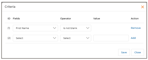 - The next step involves drag-dropping the “Criteria” and defining the criteria. In this example, the criteria are configured using the ‘Is Not Blank’ operator for the field ‘First Name’.