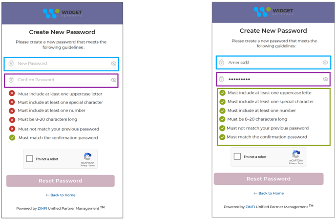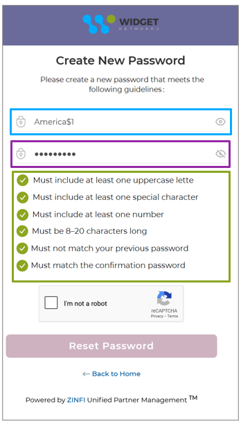 - The ‘Create New Password’ screen includes two fields: ‘New Password’ and ‘Confirm Password’. The User is required to enter his/her desired password into the New Password field (highlighted in blue). To ensure accuracy, the same password must be re-entered into the Confirm Password field (highlighted in purple) for verification.