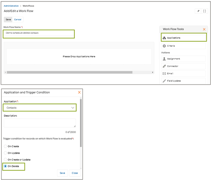 - Proceed by entering the Workflow Name. Next, drag and drop the Application Name and select Contacts. Afterward, choose the ‘On Delete’ action and click Save. This configuration ensures that the workflow is triggered whenever a Contact record is deleted.