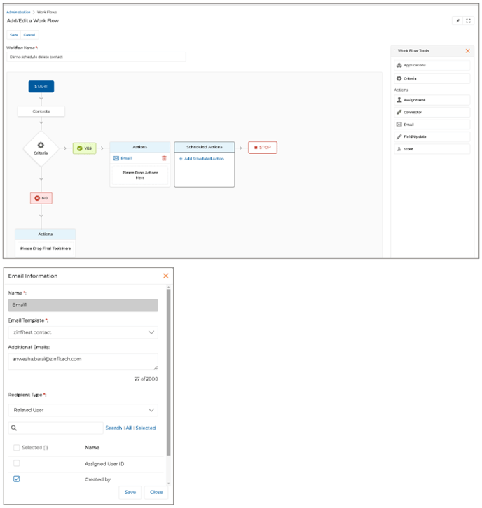 - To configure the Criteria-Success Action, drag and drop the Email field onto the “Yes-Actions” Window. Then, provide the necessary email details, such as selecting the email template, specifying the recipient type, and any other required information. Finally, click Save to complete the setup.