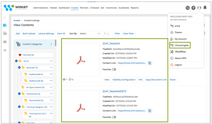 - On the View Contents page, all the contents whose visibilities are tagged with the User Profile Country, i.e. USA, will be visible irrespective of the Country selected in the Country-Language selection page.